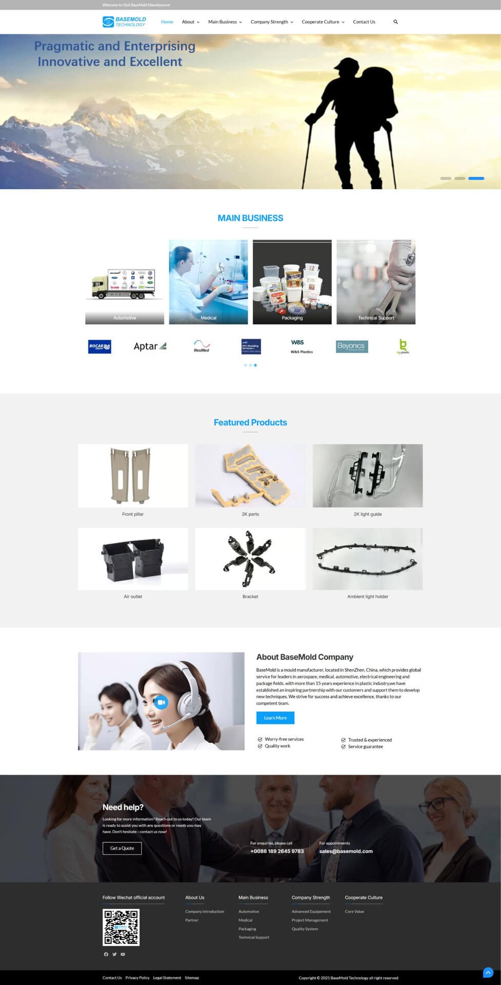 为了突显 BaseMold 的专业制造与供应链能力,我们为其设计了一个结构清晰、专业可信的企业官网。主要模块包括:企业简介与资质/工厂能力介绍 + 服务/能力展示(模具设计制造 + 注塑服务 + OEM/ODM 服务) + 行业/产品适用(汽车、电子、家电、医疗等) + 成功案例/合作客户 + 联系/询盘入口。