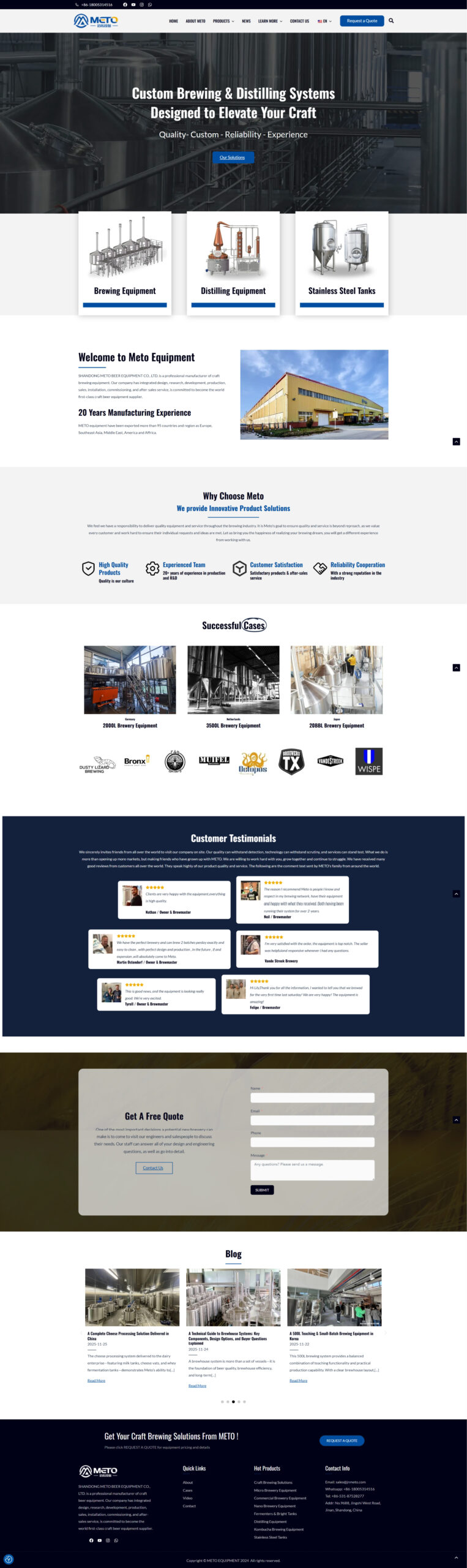 Meto Equipment 是一家专业生产精酿啤酒与蒸馏设备、不锈钢发酵/储罐和整体啤酒厂配套系统的制造商,服务对象包括手工酿造厂、酒厂、酒吧、餐厅等。他们业务涵盖从小型 nano/micro‑brewery 到中大型 commercial brewery,全流程包括设备设计、生产、销售、安装、调试与售后服务,面向全球市场,产品已出口到约 95 个国家和地区。该客户希望通过官网建立一个专业、国际化、可信赖的品牌形象,让全球买家、酒厂创业者或酒吧业主都能直观了解其设备种类、定制能力与交钥匙服务,从而推动业务拓展与国际合作。