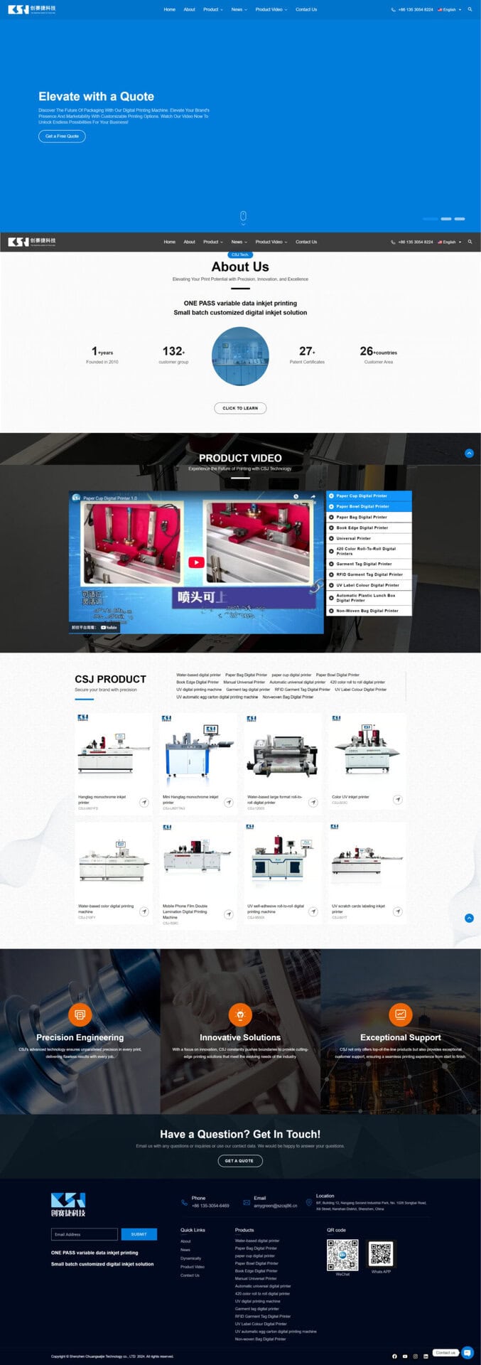 为了贴合 Chuangsaijie 的定位与国际市场需求,我们为其官网设计了简洁专业、结构清晰的信息架构。主要模块包括:产品展示 (Digital Printing Machine, Label Printer, Paper Bag / Flexible Packaging Printer, Paper Cup Printer 等)、公司介绍 + 厂房资质 + 研发背景、OEM/ODM 服务说明 + 定制能力、出口/国际合作说明、以及 联系我们 / 询盘入口。这样的结构方便不同国家/地区的采购商快速找到他们关心的设备与服务信息。