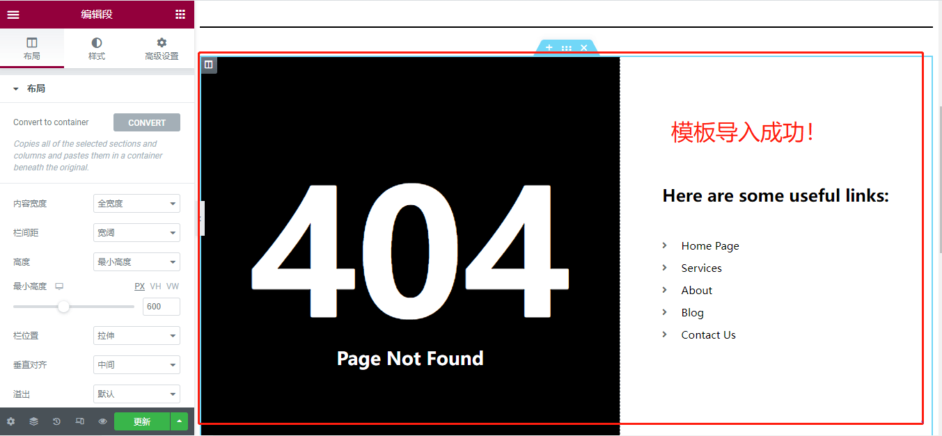 链接成功会自动回到Elementor编辑界面,模板已经成功导入,保存后期前台查看一切现实正常。如果链接账户后没有自动跳转,回到Elementor编辑界面刷新页面即可。