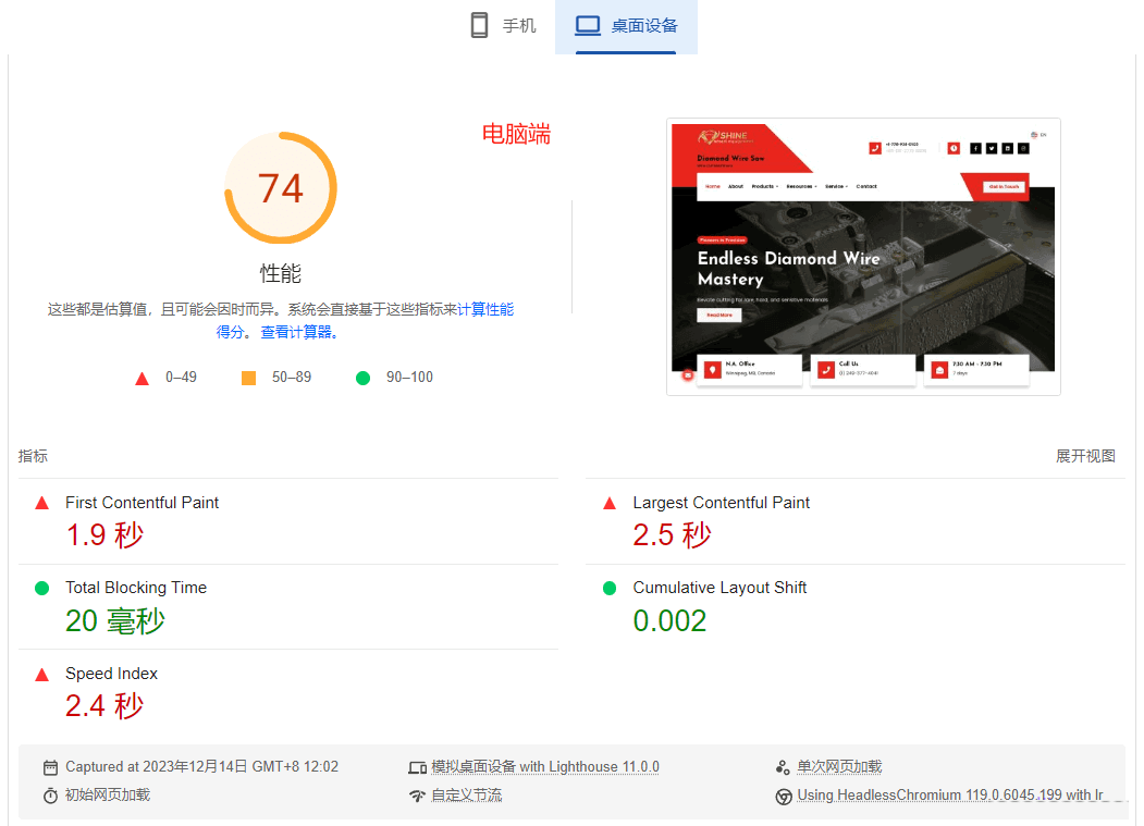 下面是一个谷歌SEO优化客户的网站谷歌测试分数,他们自己纯用古腾堡搭建页面,没有安装Elementor之类页面构建器。可是速度很慢,还不如Astra直接导入的Elementor模板速度快。