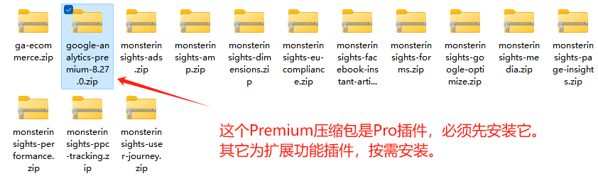 无需安装免费版本。下载安装包后,先解压出来,其中google-analytics-premium开头的(下图第二个)压缩包是MonsterInsights Pro插件,必须先安装它。其它压缩包为扩展功能插件,按需安装。