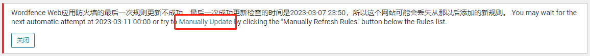 如果提示下图内容:“Wordfence Web应用防火墙的最后一次规则更新不成功…”,点击“Manually Update”。