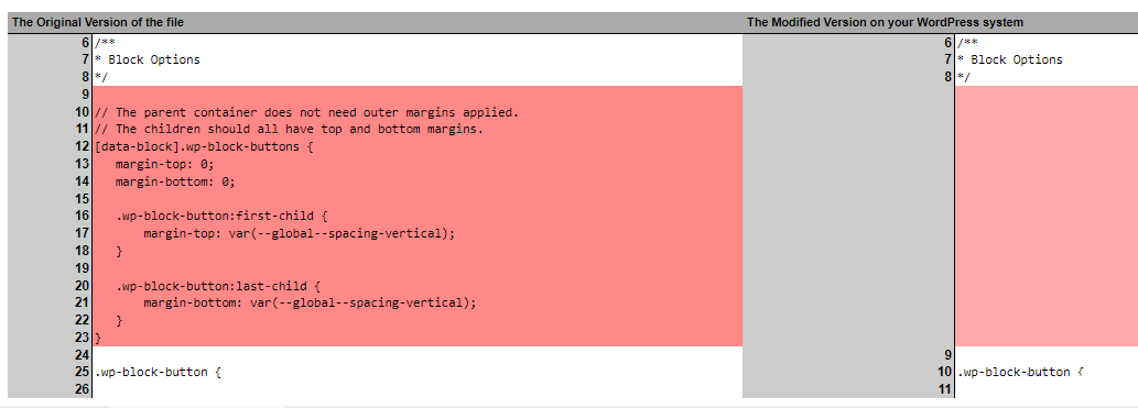 例如下图是文件差异对比,左边是源文件,右边是新文件,红色背景部分表示新文件比源文件少了一些代码。从下图可以看出新文件少了几行CSS代码(9-23行)。css代码不影响安全性之类,可点击“总是忽略”。