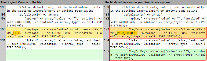 下图橙色背景部分表示GPL插件新文件跟源文件的代码有部分差异,新文件添加了“PAID CURRENT”绕过插件激活验证,文件是安全的,可点击“总是忽略”。