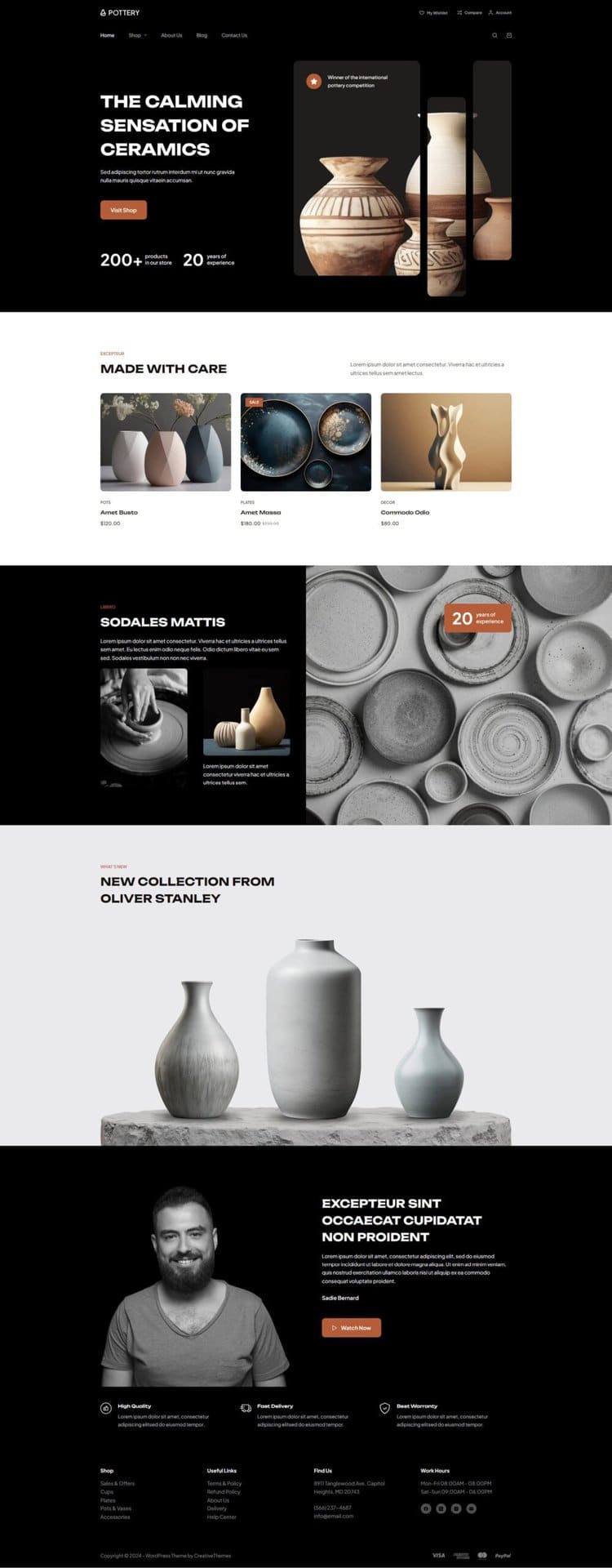 Pottery 拥有精美的设计,可以帮助您快速启动手工店,是完美的入门网站选择。深色色调令人赏心悦目,柔和的色彩点缀,真正让您的产品和信息在页面上熠熠生辉。